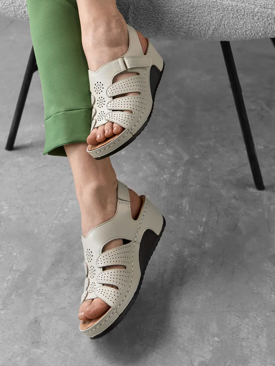 Бежевые, молочные босоножки с завязками и ремнями на щиколотке – это классика, которая никогда не выйдет из моды. Они украшены перфорированым рисунком, что добавляет им элегантности и стиля. Эти босоножки также подходят для пляжа и отдыха у моря, благодаря своей легкой и дышащей конструкции.