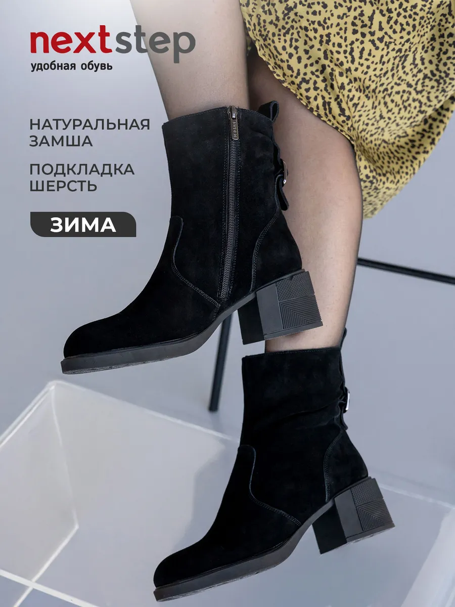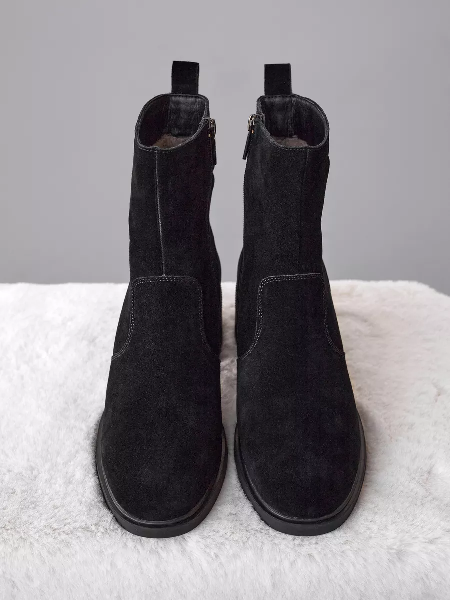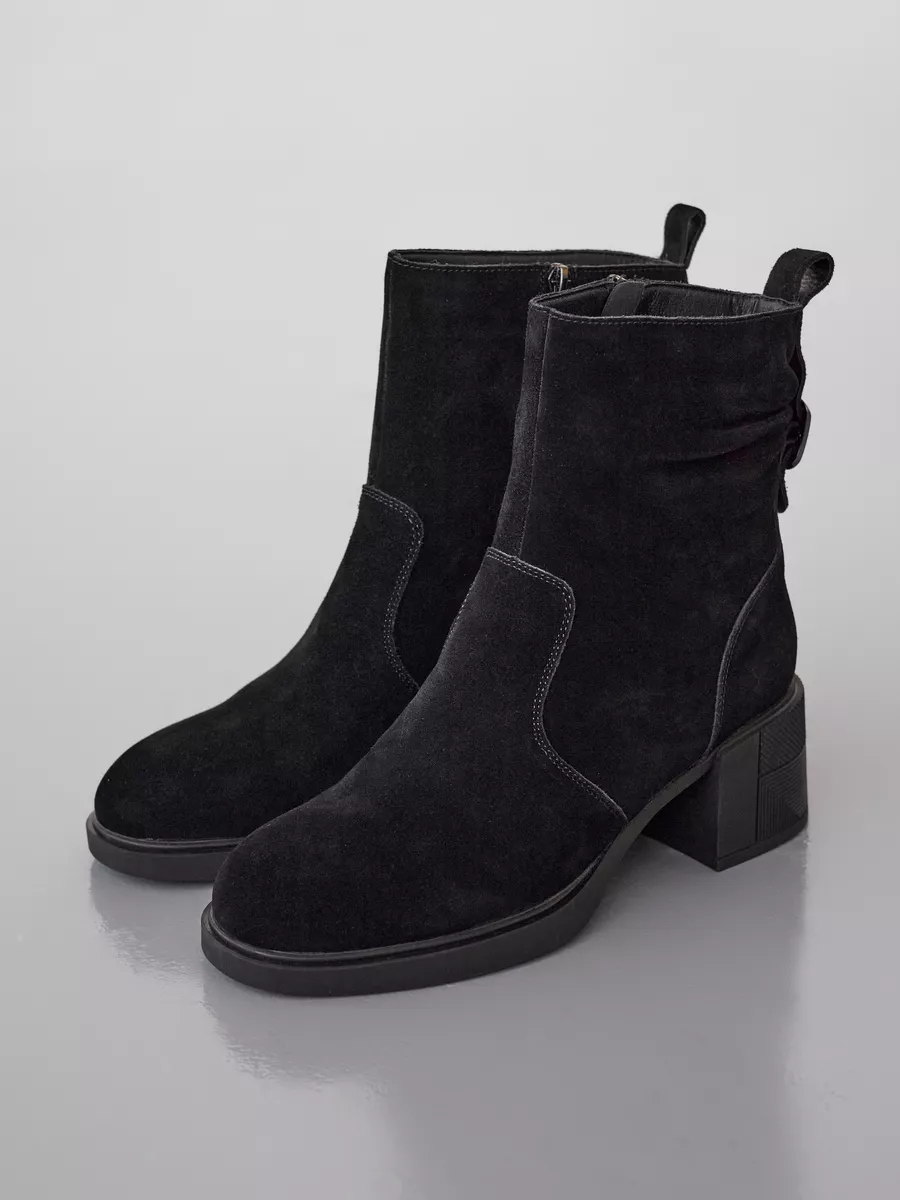 Ботильоны на каблуке выполнены из натуральной замши и дополнены вставками, придающими модели современный и стильный вид. Каблук средней высоты обеспечивает женственность и элегантность, а удобная колодка позволяет носить обувь в течение всего дня без ощущения усталости. Черные ботильоны прекрасно сочетаются с различными нарядами, будь то офисные образы или более повседневные варианты. Это универсальная зимняя обувь, которая гармонично впишется в любой гардероб.