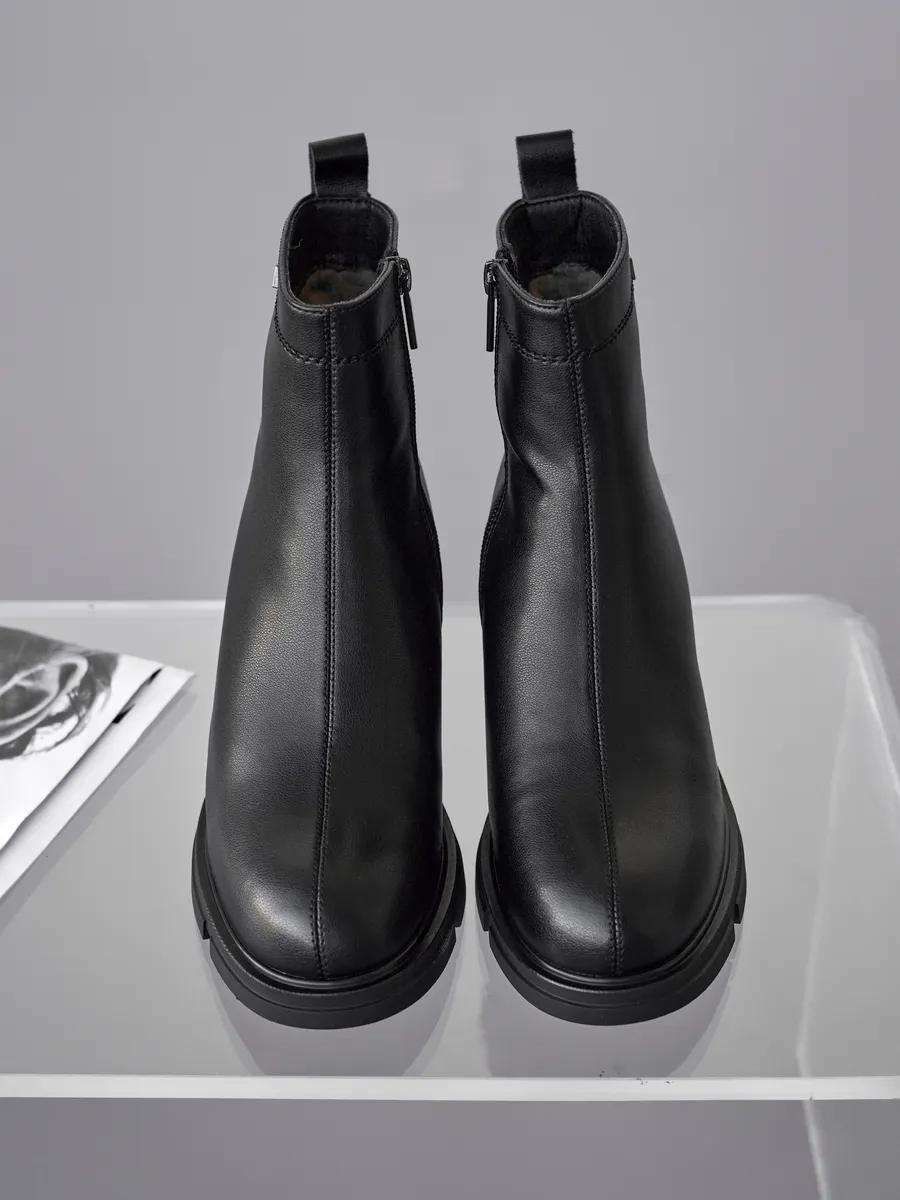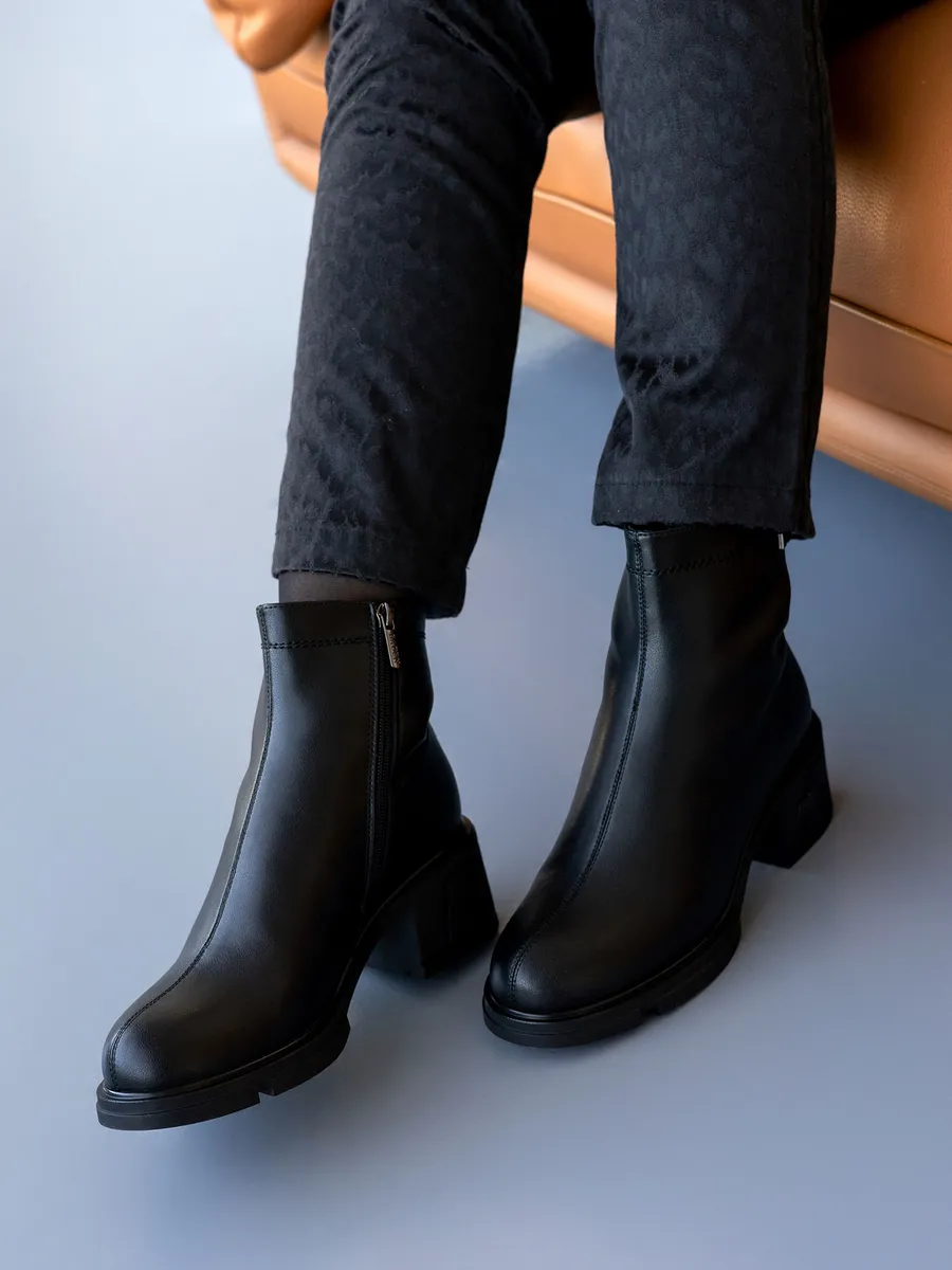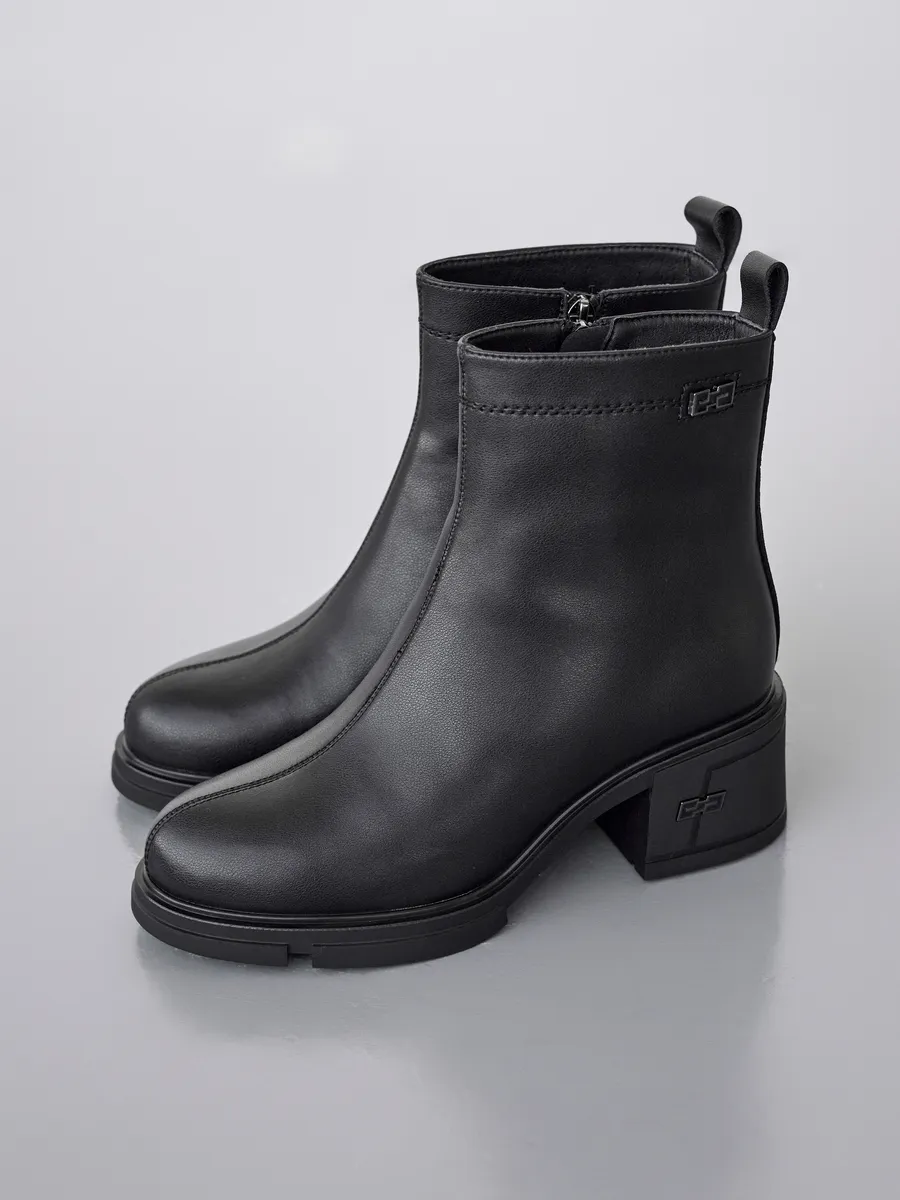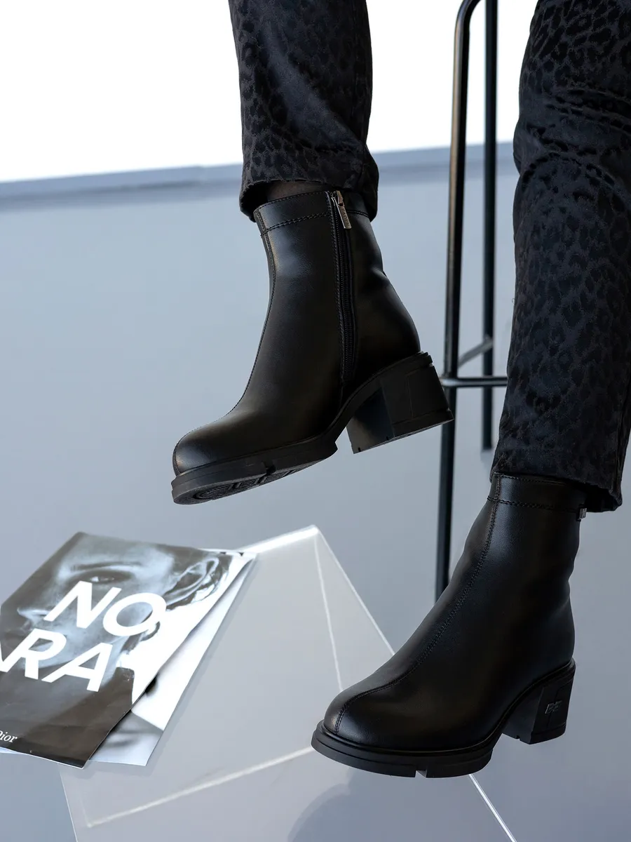 Наши короткие полусапожки черного цвета изготовлены из натуральной кожи, что гарантирует долговечность и элегантный внешний вид. Съемная стелька с ортопедическим эффектом и устойчивый каблук обеспечиват максимальный комфорт ходьбе, даже на скользкой поверхности.