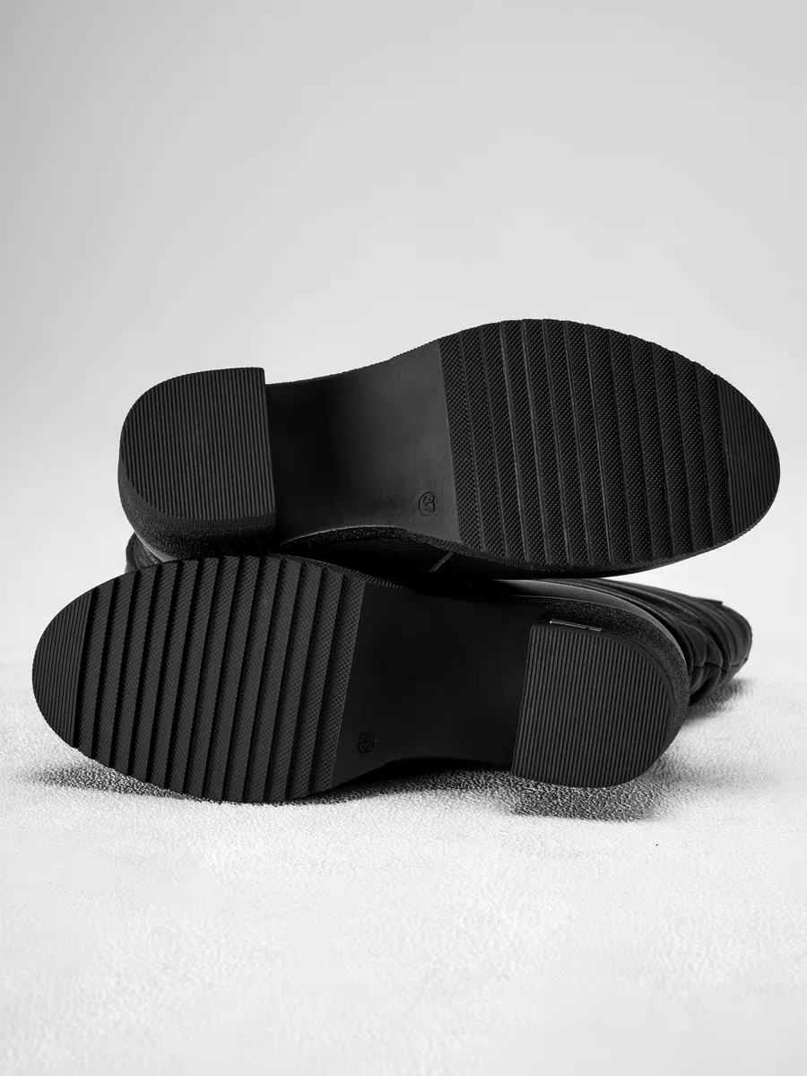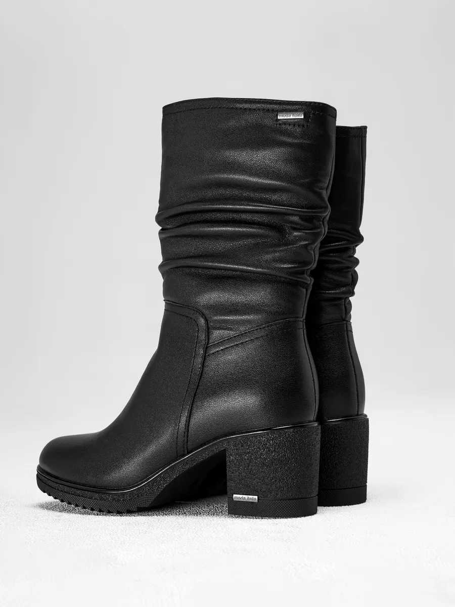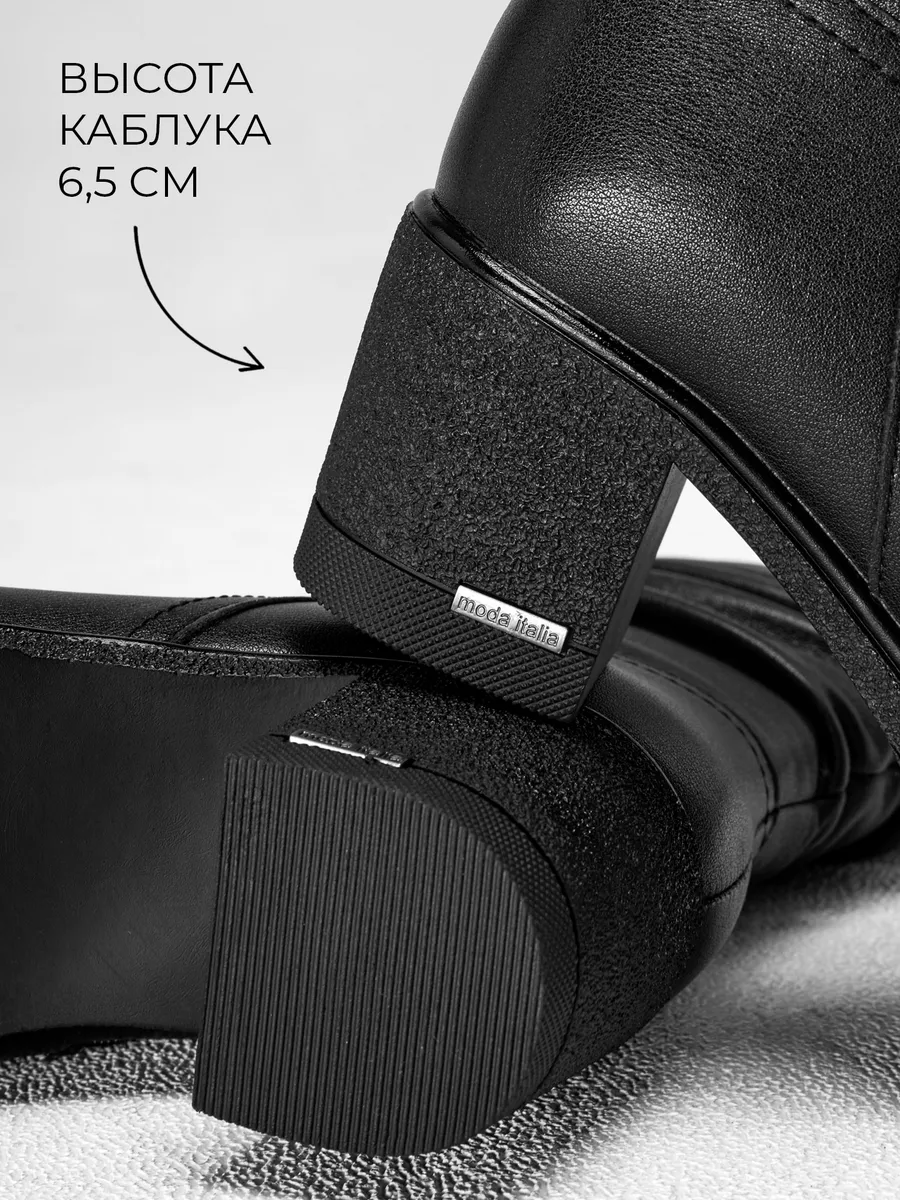 Удобный низкий каблук позволят ощущать себя более устойчиво на скользкой поверхности в зимний период. Классические короткие сапоги черного цвета подойдут к любому наряду, делая Ваш образ неповторимым. Эти сапоги - тренд 2025 года.