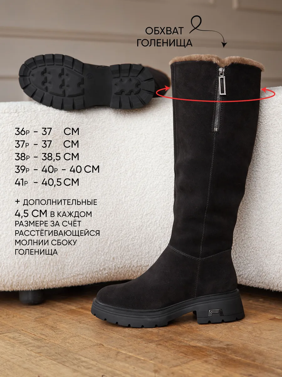Сапоги выполненные из высококачественной натуральной замши обеспечивают долговечность и комфорт. Длинные сапоги с функциональной молнией на верхней части голенища позволяют увеличить обхват примерно на 4,5 см. Подкладка и съемная стелька из натуральной шерсти гарантирует тепло ваших ног в сильные морозы. Тракторная подошва позволит чувствовать себя устойчиво на скользкой поверхности.